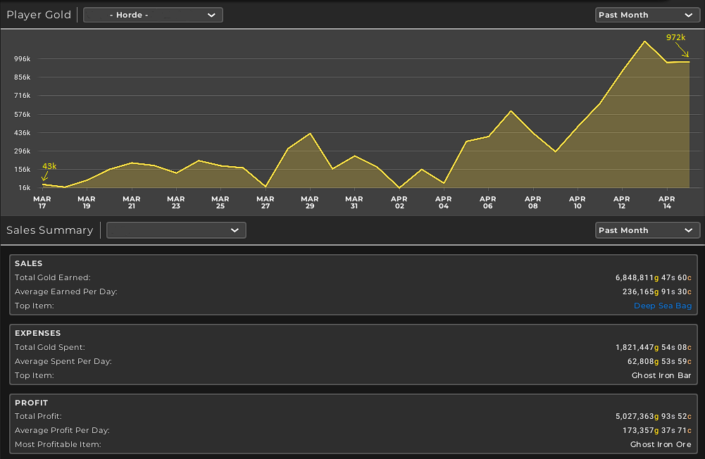 Below I’ve added my graph from my TSM4 dashboard. Please bear in mind, this is solely for this realm and character only. I’ve also edited out my name and realm because I know you guys like to find me (wink wink).