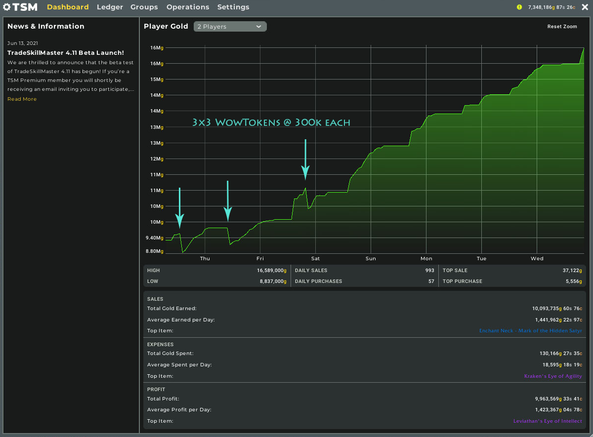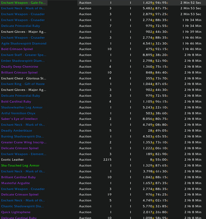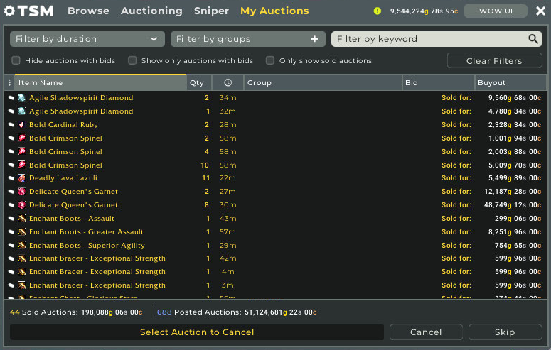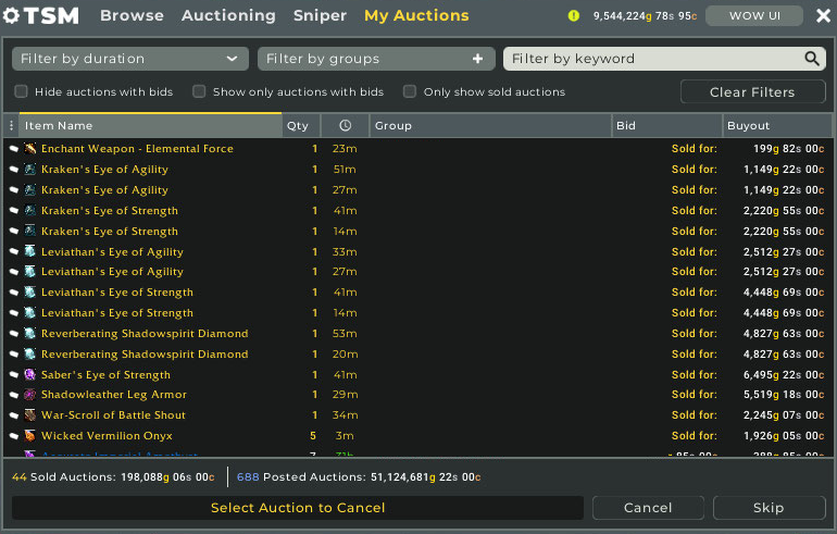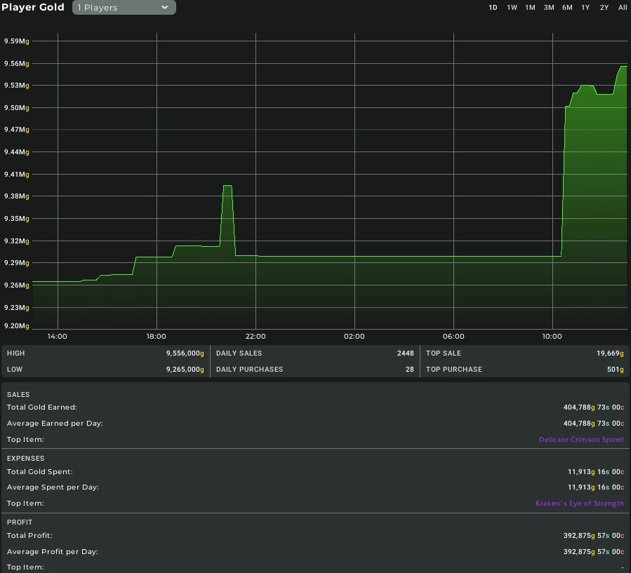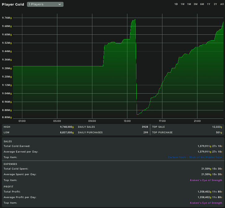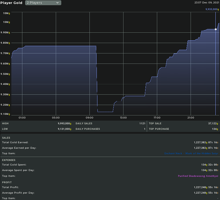 As of the 8th December at 23:55 (last update), I made 1,379,911 gold. The top item sold is, 40x Enchant Neck: Mark of the Hidden Satyr at 5.5k each.